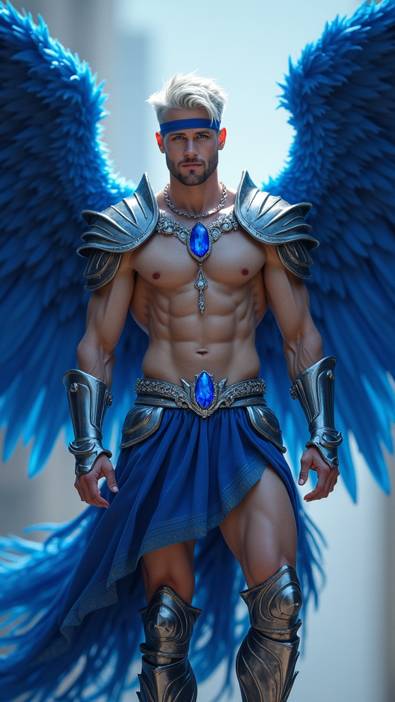 Angel, celestial, Angel of the Blue Star (Rigel). Hypermasculine male. Tall, muscular, strong, wide shoulders, broad chest, narrow waist, powerful legs, Olympian body. Fair, pale skin. Handsome, manly face. Strong brow, chiseled jaw. Electric blue eyes, soulful and deep. Short wavy fade hairstyle {{{short hair}}} with slightly longer hair towards the front of his head {{white hair}} . A Cerulean blue silk band tied around his forehead and brow. Shiny silver pauldrons accented with sapphires on both shoulders, A silver chain with a sapphire pendant around his neck. He wears a metallic blue harness on his chest, and metallic blue bracers strapped to his arms. An ornate silver belt with sapphires around his waist. He wears a sapphire blue loincloth with silver edges/piping , the loincloth covering an impressive bulge and exposing his strong, muscular legs. Knee high metallic, blue boots of the same color. His enormous, feathery Angel wings are predominantly cobalt blue, gradating into lighter shades of blue towards the outer parts of his wings. He carries a huge battle sword made of blue flames, and he radiates a deep blue aura, for he is the Angel of the Blue Star. Full body pose. He is somewhere amongst the stars.