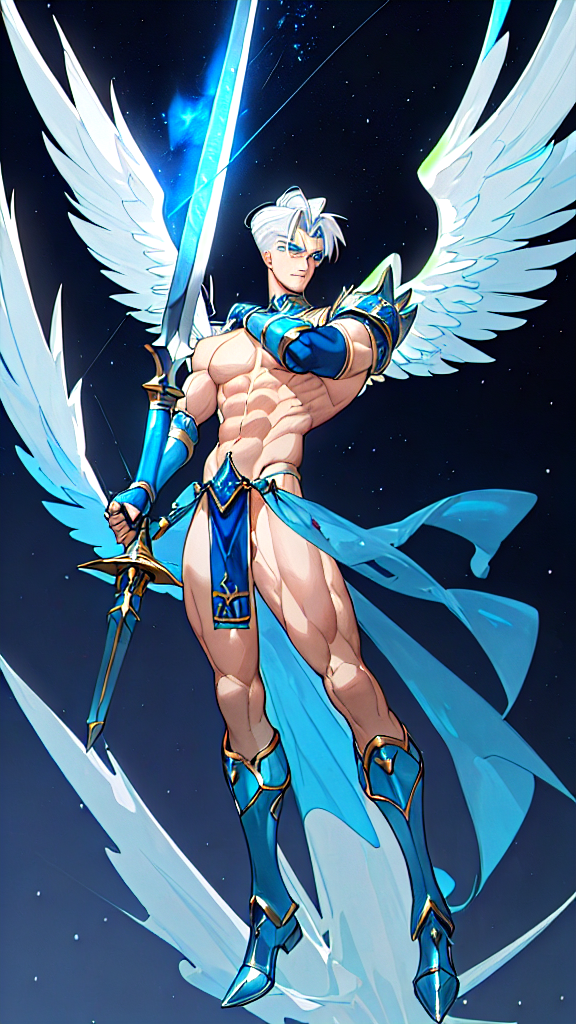 Angel, celestial, Angel of the Blue Star (Rigel). Hypermasculine male. Tall, muscular, strong, wide shoulders, broad chest, narrow waist, powerful legs, Olympian body. Fair, pale skin. Handsome, manly face. Strong brow, chiseled jaw. {{{Clean shaven, smooth face}}}. Electric blue eyes, soulful and deep. Short wavy fade hairstyle {{{short hair}}} with slightly longer hair towards the front of his head {{white hair}} . A Cerulean blue silk band tied around his forehead and brow. Shiny silver pauldrons accented with sapphires on both shoulders, A silver chain with a sapphire pendant around his neck. He wears a metallic blue harness on his chest, and metallic blue bracers strapped to his arms. An ornate silver belt with sapphires around his waist. He wears a sapphire blue loincloth with silver edges/piping , the loincloth covering an impressive bulge and exposing his strong, muscular legs. Knee high metallic blue boots of the same color. His enormous, feathery Angel wings are predominantly cobalt blue, gradating into lighter shades of blue towards the outer parts of his wings. He carries a huge battle sword made of blue flames, and he radiates a deep blue aura, for he is the Angel of the Blue Star. Full body pose. He is somewhere amongst the stars.