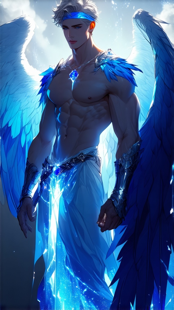 Angel, celestial, Angel of the Blue Star (Rigel). Hypermasculine male. Tall, muscular, strong, wide shoulders, broad chest, narrow waist, powerful legs, Olympian body. Fair, pale skin. Handsome, manly face. Strong brow, chiseled jaw. Electric blue eyes, soulful and deep. Short wavy fade hairstyle {{{short hair}}} with slightly longer hair towards the front of his head {{white hair}} . A Cerulean blue silk band tied around his forehead and brow. Shiny silver pauldrons accented with sapphires on both shoulders, A silver chain with a sapphire pendant around his neck. He wears a metallic blue harness on his chest, and metallic blue bracers strapped to his arms. An ornate silver belt with sapphires around his waist. He wears a sapphire blue loincloth with silver edges/piping , the loincloth covering an impressive bulge and exposing his strong, muscular legs. Knee high metallic, blue boots of the same color. His enormous, feathery Angel wings are predominantly cobalt blue, gradating into lighter shades of blue towards the outer parts of his wings. He carries a huge battle sword made of blue flames, and he radiates a deep blue aura, for he is the Angel of the Blue Star. Full body pose. He is somewhere amongst the stars.