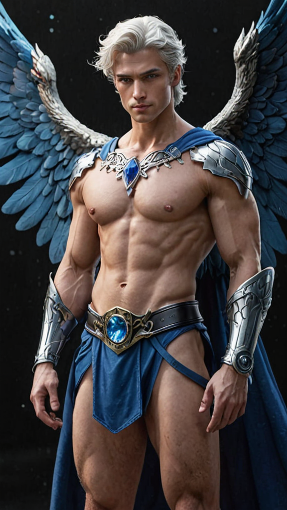 Angel, celestial, Angel of the Blue Star (Rigel). Hypermasculine male. Tall, muscular, strong, wide shoulders, broad chest, narrow waist, powerful legs, Olympian body. Fair, pale skin. Handsome, manly face. Strong brow, chiseled jaw. Electric blue eyes, soulful and deep. Short wavy fade hairstyle {{{short hair}}} with slightly longer hair towards the front of his head {{white hair}} . A Cerulean blue silk band tied around his forehead and brow. Shiny silver pauldrons accented with sapphires on both shoulders, A silver chain with a sapphire pendant around his neck. He wears a metallic blue harness on his chest, and metallic blue bracers strapped to his arms. An ornate silver belt with sapphires around his waist. He wears a sapphire blue loincloth with silver edges/piping , the loincloth covering an impressive bulge and exposing his strong, muscular legs. Knee high metallic, blue boots of the same color. His enormous, feathery Angel wings are predominantly cobalt blue, gradating into lighter shades of blue towards the outer parts of his wings. He carries a huge battle sword made of blue flames, and he radiates a deep blue aura, for he is the Angel of the Blue Star. Full body pose. He is somewhere amongst the stars.