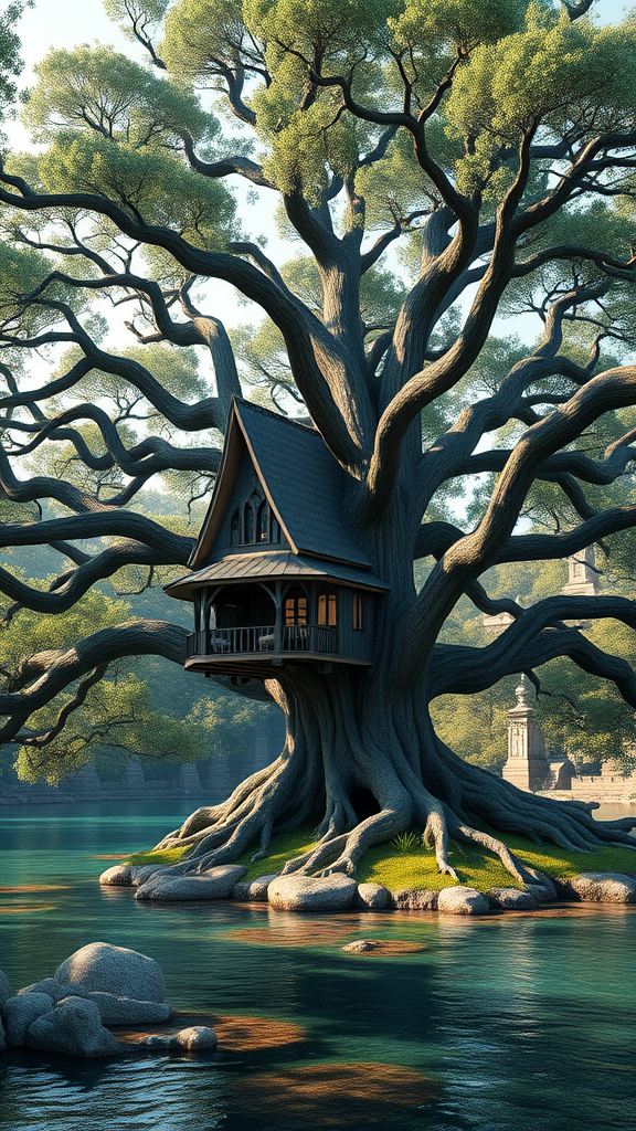 Angel Oak tree house, a stunningly intricate and ornate structure nestled within a magnificent, colossal turquoise Angel Oak, situated by a river with crystal-clear waters, evoking a sense of tranquility and natural beauty. This scene is captured through professional architecture renders focusing on photorealistic, high-quality, and detailed 3D representations using 3D Studio Max and V-Ray. Designed by Emmanuel Lubezki, Antonio J. Manzanedo, Alberto Vargas, and Mark Simonetti, this award-winning project showcases realistic materials and precise dimensions with multiple angles and perspective views. The creative twist introduces subtle, ethereal lighting that enhances the whimsical atmosphere while maintaining architectural accuracy, offering a seamless blend of art and nature.