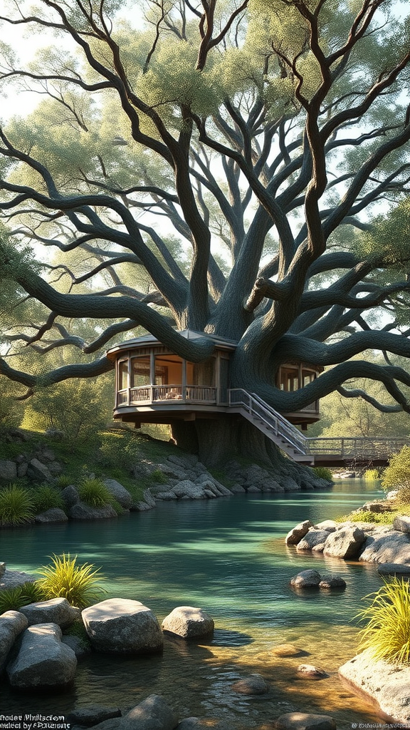 Angel Oak Treehouse, a stunning and intricate architectural marvel nestled within the branches of a colossal turquoise Angel Oak, perched on the serene bank of a river with crystal clear waters. Rendered through the expertise of professional architecture artists, the design showcases photorealistic 3D rendering, capturing the high-quality and detailed essence of the treehouse. Utilizing 3D Studio Max and V-Ray, the representation boasts professional, corporate aesthetics, reminiscent of award-winning works by the likes of Emmanuel Lubezki, Antonio J. Manzanedo, Alberto Vargas, and Mark Simonetti. The structure features realistic materials and exact dimensions, offering multiple perspectives and angles. The creative vision includes subtle artistic adjustments, enhancing the overall beauty of the scene.