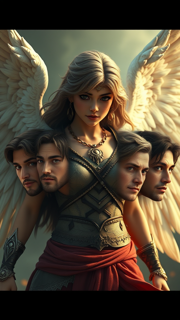 Angelic warrior, hyper-realistic, showcasing five intricately detailed character expressions, ultra-detailed quality 3D render, enhanced with volumetric lighting, cinematic aspect ratio 9:16, high-quality rendering, subtle atmospheric effects, ethereal atmosphere, dynamic pose capturing motion and grace.
