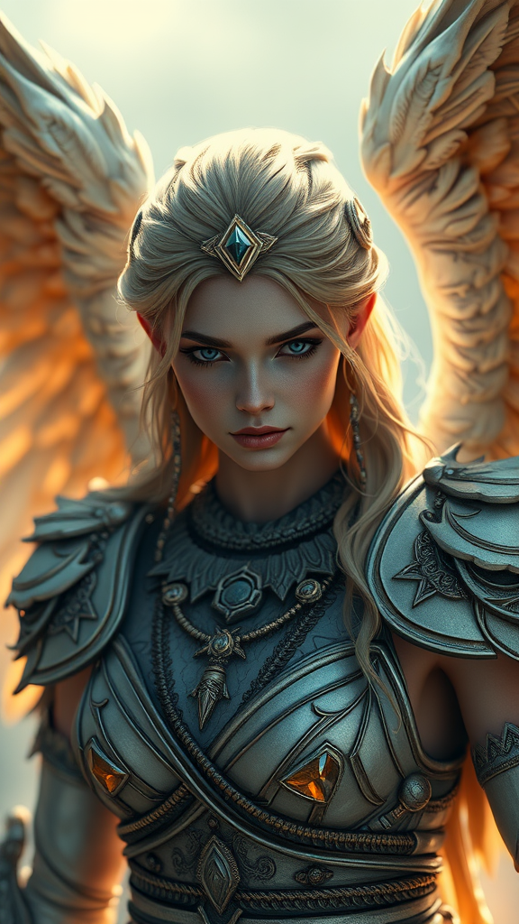 Angelic warrior in hyper-realistic style with intricate character expressions and ultra-detailed 3D rendering using Octane Render, featuring ethereal volumetric lighting, cinematic proportions 9:16, enhanced visual quality, and slight artistic flair with a spiritual and ethereal essence.