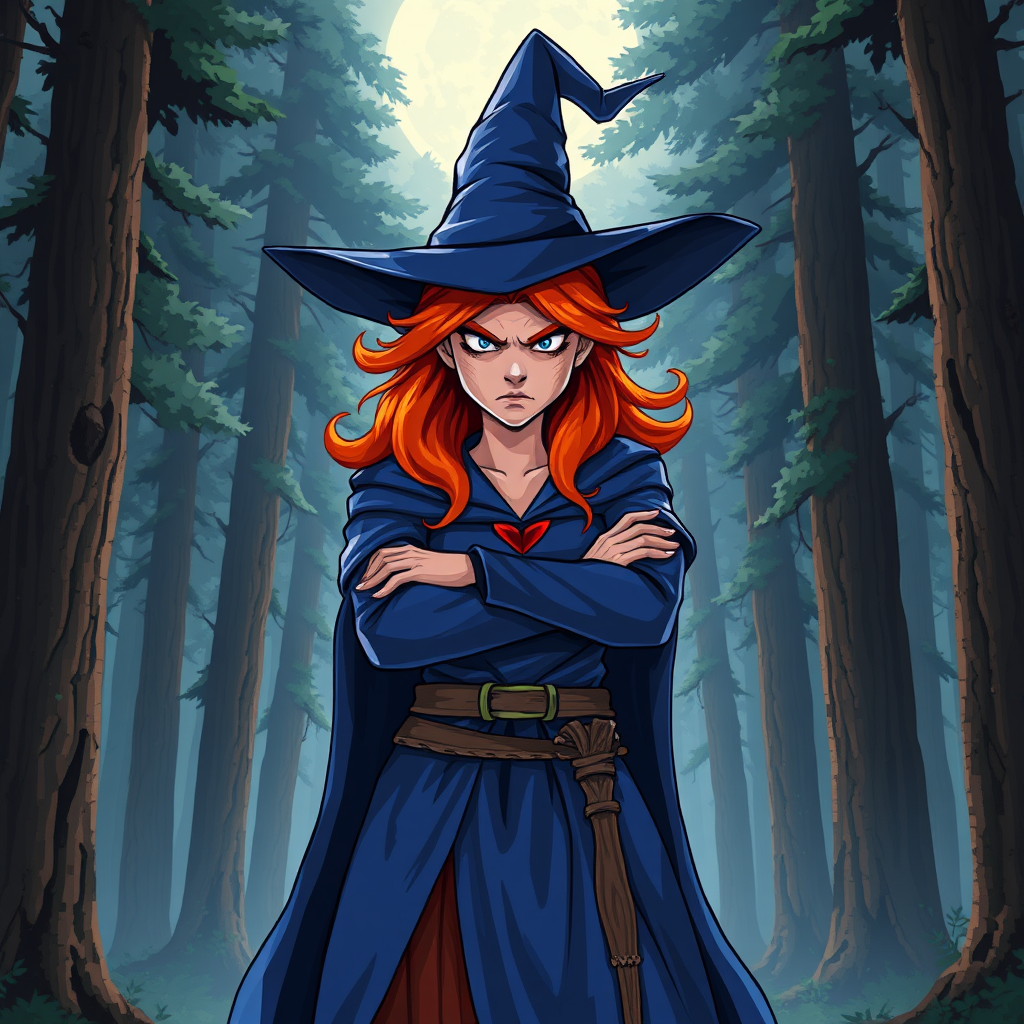Angry female witch standing in a forest, arms crossed, sporting a striking blue pointy hat with wild orange hair flowing beneath, clad in a flowing blue cape and cloak, surrounded by towering trees and dappled moonlight, rendered in vibrant 64-bit pixel art style.
