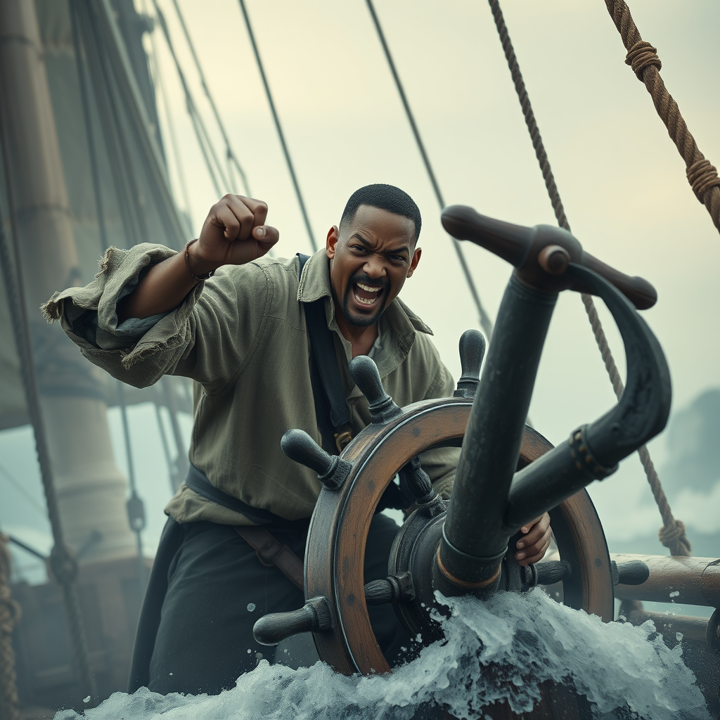 Angry gesticulating Will Smith smashes his fists on the ancient, weathered wooden wheel of the pirate ship, his wide-sleeved linen shirt frayed and tattered, as he bellows through the misty, charcoal-grey sea fog on the high waves. The mischievous glint in his eye flashes like a spark of blue-gray quartz, as he berates the limp, porpoise-gray sails, that threaten to betray the winds and leave the crew to the mercy of the waves. A chilling, fossil-encrusted anchor juts out from the ship's hull, its squared-off edges etched into the flint-like morning light of dawn. A splintered piece of charred wood, wedged between two bloated, putrid barrels, protests in a grind of splintered grain, as Will unleashes a torrent of guttural rants, inflaming the excess passions of the crew, residues in darker, volatile recesses of human turmoil. Against this bleak and mournful backdrop, Jack's red-white multi-colored shouting shirt bursts forth, pitted into confusing breadth by telltale reflective flushes of white rising boldly against snapshots framing eternal fury with hellish courageous abandon.