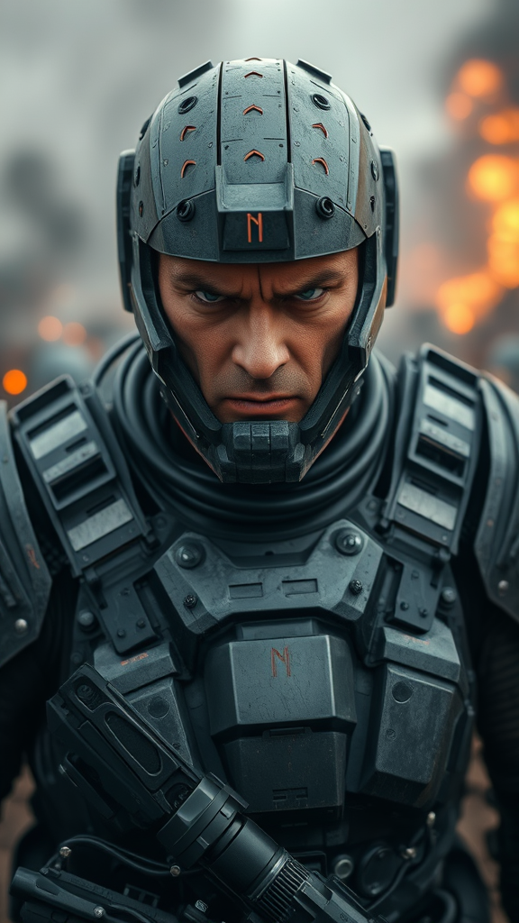 Angry marine in advanced cybernetic combat armor, mechanical and futuristic, set against an apocalyptic battlefield. The marine is intensely focused on the viewer, with detailed, realistic skin textures. The image captures the marine in full length with an emphasis on hyperrealism, utilizing cinematic lighting and 8k resolution for an incredibly detailed portrayal. Soft diffused lighting and a shallow depth of field highlight the marine's determined expression, while ensuring sharp focus and photo-realistic qualities. The environment echoes a chaotic yet epic war scene. The artwork maintains high detail in RAW color, creating a vivid and immersive experience, without compromising on composition or quality.
