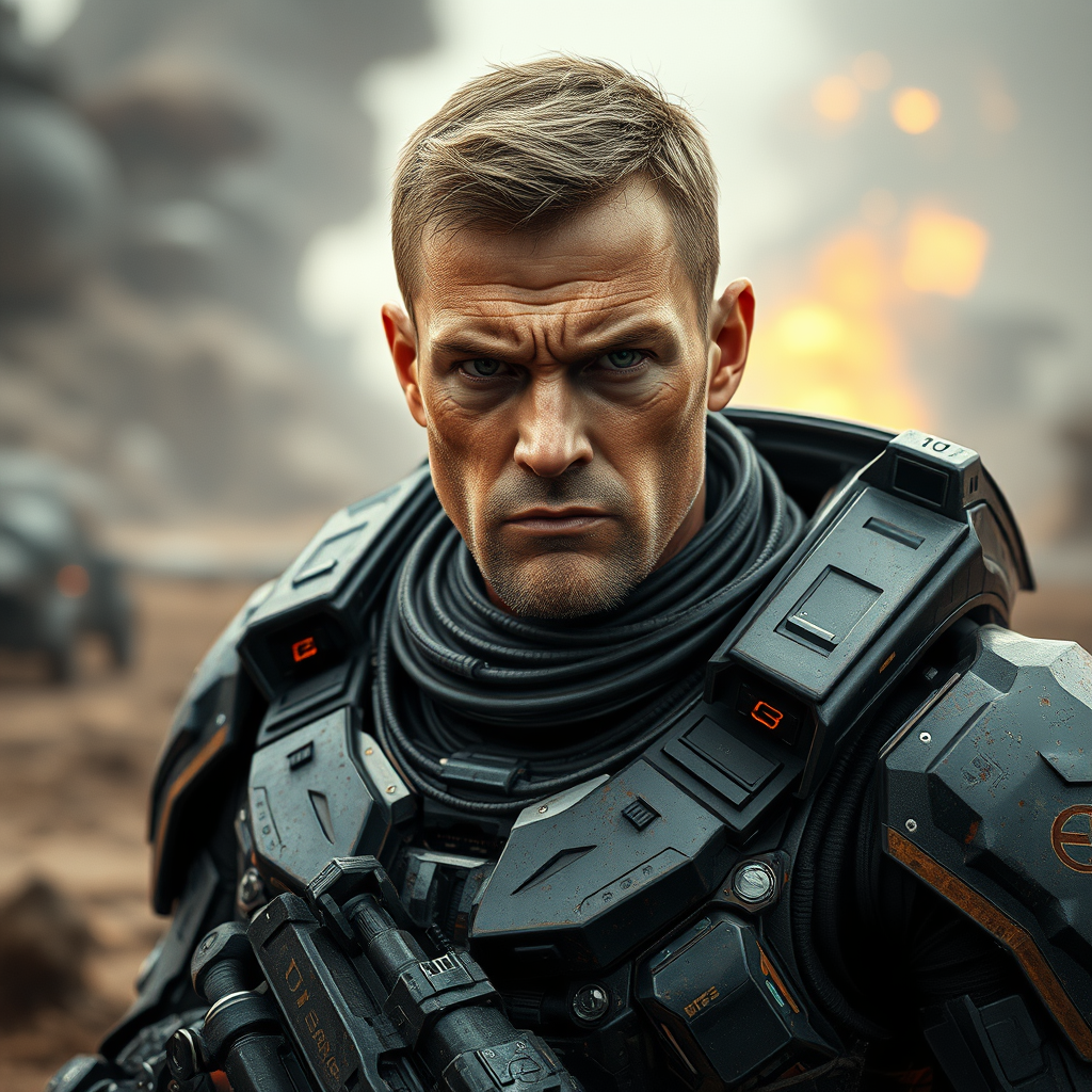 Angry marine in cutting-edge cybernetic combat armor stands amidst a futuristic, apocalyptic war landscape, gazing intensely at the viewer. The scene captures an ultra-realistic photographic quality, with focus on highly detailed skin texture and intricate armor design. Shot in 8k resolution, the image features a full-length frame with a sharp focus and shallow depth of field. Diffused soft lighting adds a cinematic touch, enhancing the hyperrealistic CGI elements. The marine's face and physique exhibit perfect anatomy, with no distortions or mutations present. The compelling visual avoids any low-quality elements, ensuring a crisp and impactful depiction of a dystopian future warrior.