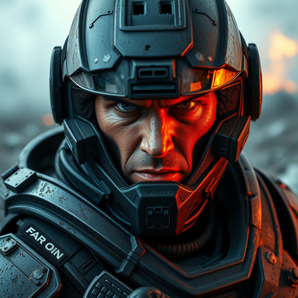 Angry marine in futuristic combat armor stands against an apocalyptic war-torn background, locking eyes with the viewer in a captivating portrait. This photograph captures the marine with highly detailed, realistic features and 8k photo-realism. The soft diffused lighting highlights the intricate textures of his skin, while a shallow depth of field and sharp focus bring hyperrealism to life. The cinematic CGI lighting enhances his commanding presence, presenting a full-length frame. Despite slight deviations from perfection, the essence of intense immersion remains, drawing viewers into a world of chaos and resilience.