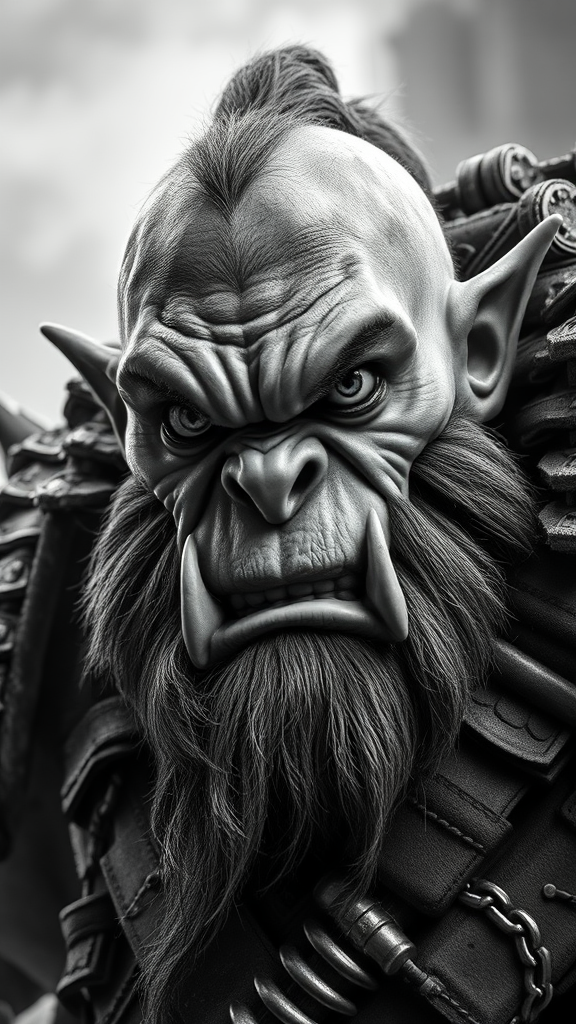 Angry orc chieftain, fierce and powerful presence, low angle for a menacing view, horror elements, octane-rendered with smooth and sharp focus, symmetrical and detailed face, resembling a masterpiece trending on ArtStation, 4k HDR clarity, influenced by art styles of Stanley Lau, Jason Chan, and Mark Hill. Orc's attire features rugged and worn textures, contrasting sharply with the smoothness of its skin, capturing a monochrome, high-contrast aesthetic. The background is a blurred haze, enhancing the orc's dominant presence in crisp black and white photography. The face is slightly shadowed, emphasizing its fierce expression, with clear and intense eyes, keeping all anatomical features proportionate and realistic. All branding, logos, and irrelevant noise are omitted for a clean, polished finish.