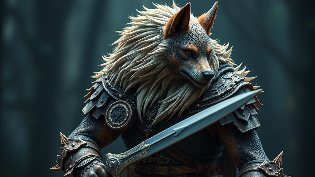 Animal wolf warrior character, anthropomorphic figure, epic fantasy, Dungeons & Dragons theme, intricately designed, hyper-realistic, masterful craftsmanship, cinematic illumination, photorealistic details, ultra-high-definition clarity, vibrant realism, dynamic pose, --aspect ratio 9:16 --style 750.