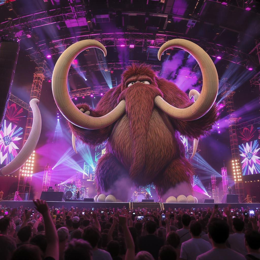 View this AI-generated image featuring a vibrant and heartwarming animation key shot captures a colossal friendly band behemoth passionately performing on stage surrounded by an adoring crowd the scene is a medium shot inspired by the enchanting styles of studio ghibli pixar and disney animations re