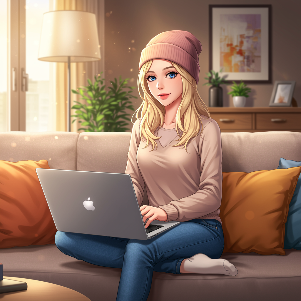Anime, 1 stunning blonde girl gazing at the camera, dressed in a thin beanie, jeans, and a cashmere pullover, comfortably seated on a couch with a MacBook in a vibrant living room. Bright colors, focus on beauty and detail while avoiding disfigurement or anatomical errors. The scene should exhibit a sense of serene creativity, with attention to realistic and elegantly proportioned features, maintaining quality and avoiding any visual flaws like floating or missing limbs or poorly drawn elements.
