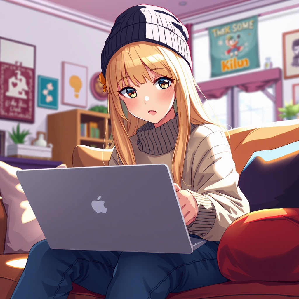 Anime, 1 stunning blonde girl gazing into the camera, adorned in a sleek beanie, dressed in jeans and a cashmere pullover, comfortably seated on a couch with a MacBook in a vibrant living room. The scene is filled with bright colors. Elements include watermark, text, and hints of artistic imperfection such as slightly distorted features and anatomical quirks. The portrayal hints at creative whimsy with touches of exaggerated proportions and surreal details, adding a unique and imaginative flair.