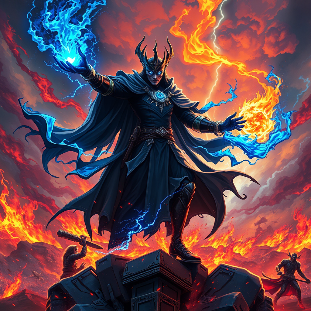 Anime 8K resolution epic scene featuring a humanoid male sorcerer prince of darkness triumphing on a chaotic battlefield. Surrounding him are vivid blue infernal flames and dynamic sparks illuminating the scene. The background depicts an apocalyptic landscape, bursting with a storm of swirling, vibrant colors. The intricate and elegant digital illustration captures the hyper-detailed essence of the sorcerer amidst the chaos, with thunderstorm elements crackling throughout, creating an intense, dramatic atmosphere.