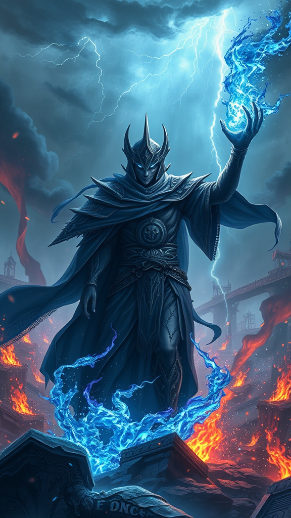 Anime, 8K resolution, mystical sorcerer humanoid male prince of shadows triumphing on the battlefield, surrounded by blue infernal flames and glowing sparks, apocalyptic setting, vibrant colors, intricate and elegant, digital illustration, breathtaking scenic view, hyper-detailed, 8k, raging thunderstorm overhead.