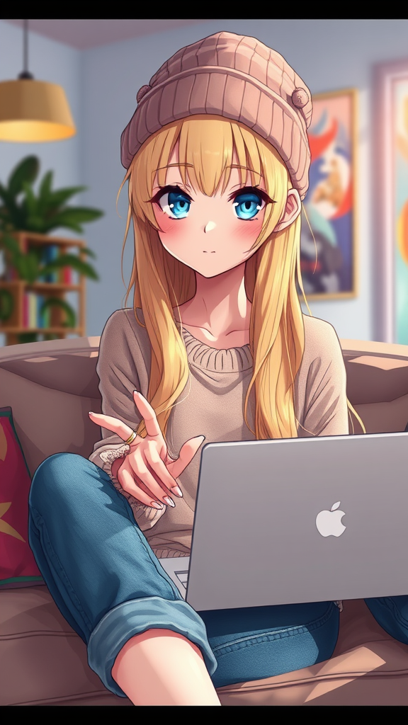 anime, a stunning blonde girl, gazing at the viewer, wearing a delicate beanie, jeans, a cashmere sweater, comfortably seated on a couch with a laptop, bright and colorful living room, Watermark, Text, distorted features, unusual anatomy, artistic quirks, extra limb, unconventional pose, unique hand positions, partial visibility, creative proportions, abstract artistic style, imaginative hands and fingers, intriguing expression, dynamic composition, captivating and unusual design elements.