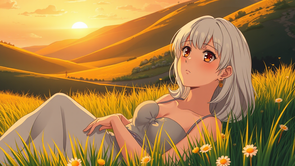 Anime art full body character concept art featuring an elegant young female with platinum blonde hair and straight bangs, large expressive eyes, and a perfectly detailed face with delicate features, gazing thoughtfully upwards. She's reclining in a lush, grassy meadow during a picturesque sunset in a serene valley. The scene is illuminated by golden hour lighting, casting a warm glow across the landscape. The artwork is rendered in a style reminiscent of Studio Ghibli, with exquisite detail and charm, trending on Pixiv Fanbox. The ambiance feels peaceful and dreamlike, capturing a moment of serene beauty.