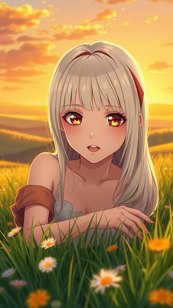 Anime art full body character concept art featuring an elegant young female with platinum blonde hair and straight bangs, her large eyes reflecting the golden hues of a sunset, finely detailed perfect face with delicate features and a directed gaze. She is gracefully laying down in a lush meadow at sunset, surrounded by rolling valleys as the golden hour bathes the scene in a warm, ethereal glow. The atmosphere echoes the enchanting style of a Studio Ghibli film, with extremely high quality artwork trending on Pixiv Fanbox, capturing the beauty of nature and the character's serene expression.