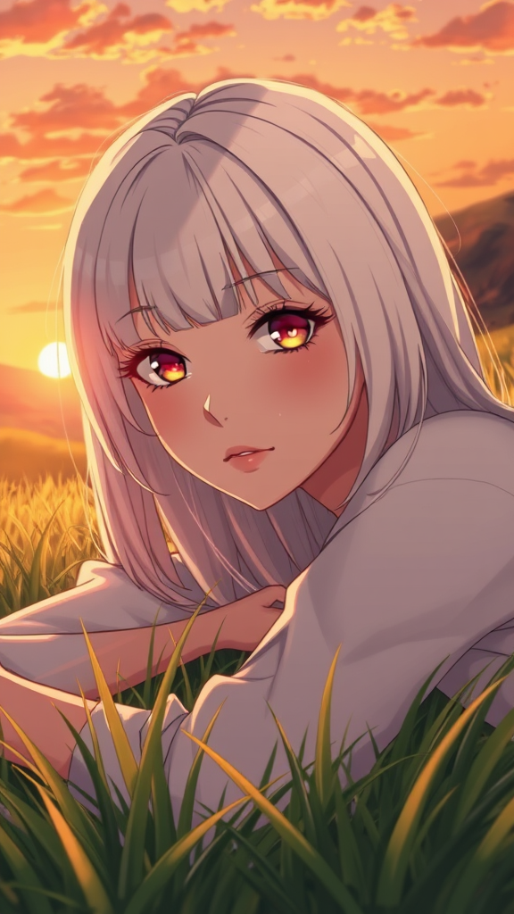 Anime art full body character concept art showcasing an elegant young female with silky platinum blonde straight bangs and large, expressive eyes. Featuring a finely detailed, flawless face with delicate features and a captivating, directed gaze. The character is reclined gracefully on a bed of soft grass during a golden hour sunset in a picturesque valley. The warm, vibrant hues of the setting sun cast a magical glow, reminiscent of a Studio Ghibli scene. The artwork is of extremely high quality, capturing the essence of tranquility and beauty, popularly featured on Pixiv Fanbox.