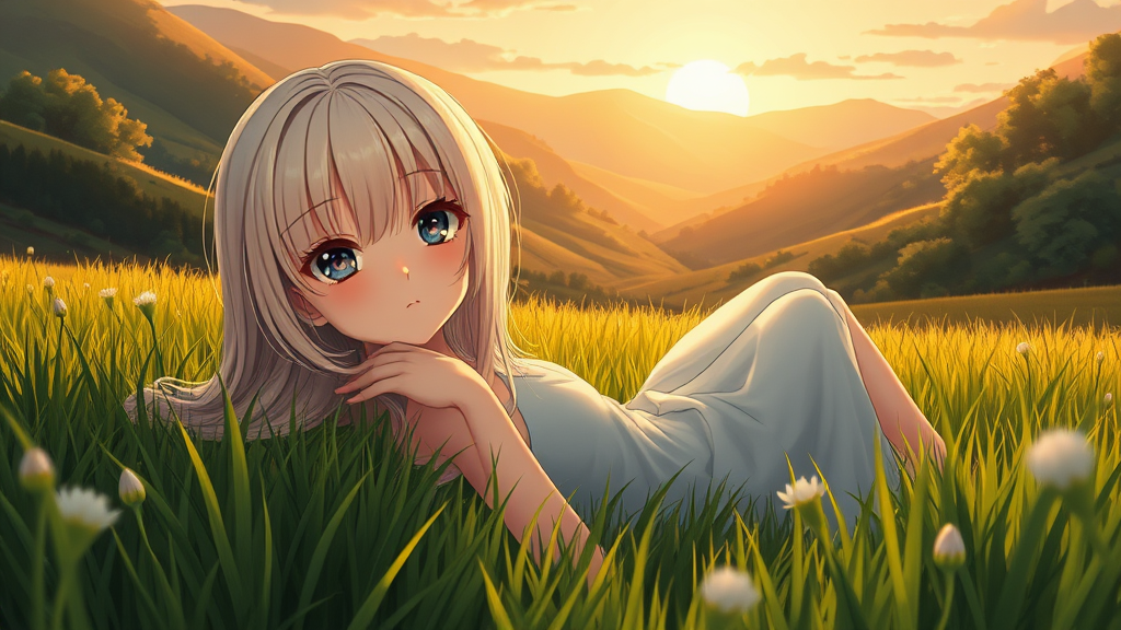 Anime art full body character concept featuring an exquisite young female with platinum blonde hair and straight bangs, large captivating eyes, and a perfectly detailed face with delicate features. The character is reclining gracefully in a lush green meadow during sunset in a quiet valley, with the gentle golden hour light casting a warm glow over the scene. The landscape carries a touch of Studio Ghibli's charm, capturing a tranquil moment with sweeping natural beauty. The artwork is of extremely high quality, evoking a sense of serenity and wonder, trending on platforms like Pixiv Fanbox.