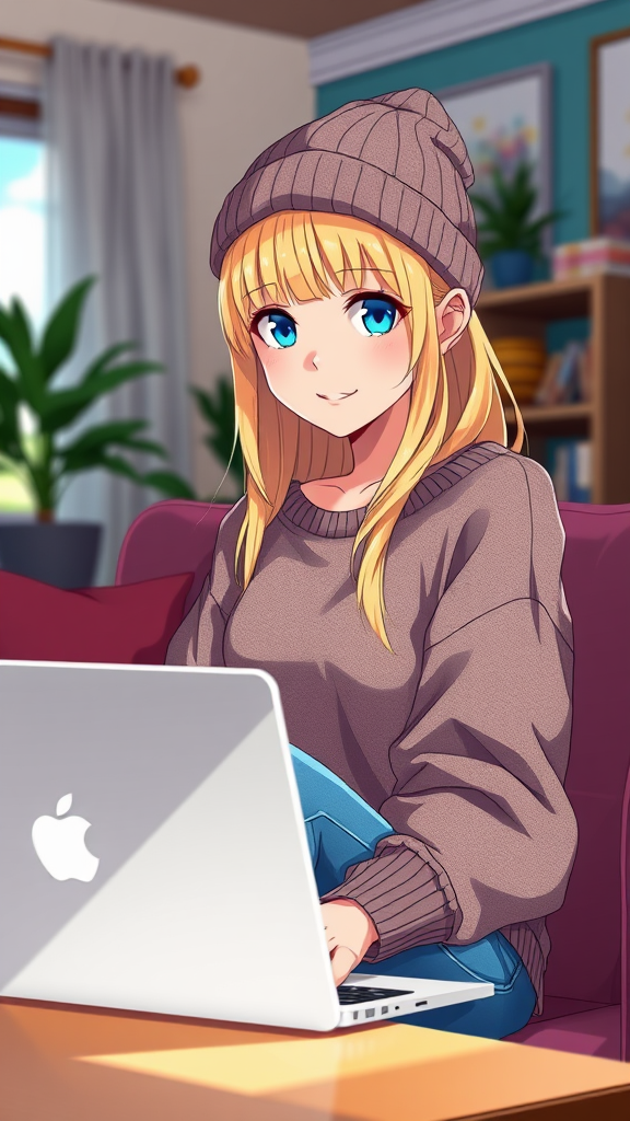 Anime, beautiful blonde girl, gazing at the camera, wearing a thin beanie, jeans, cashmere pullover, seated on a couch with a laptop, in a vibrant living room. Bright colors, with added details like sharp, expressive eyes and a warm smile, capturing a serene and stylish atmosphere. Careful attention to normal anatomy, ensuring well-proportioned features and elegant posture.