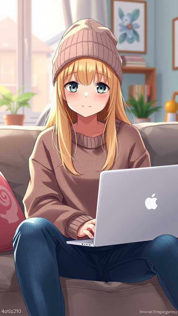 Anime, beautiful blonde girl gazing at the camera, wearing a thin beanie and jeans, a cozy cashmere pullover, sitting comfortably on a couch with a MacBook in a brightly colored living room. Elements like a watermark and text are present. Avoiding characteristics such as distorted features, extra or missing limbs, and poor drawing quality. The composition maintains a natural appearance with proper anatomy, proportionate features, and a well-drawn, expressive face.