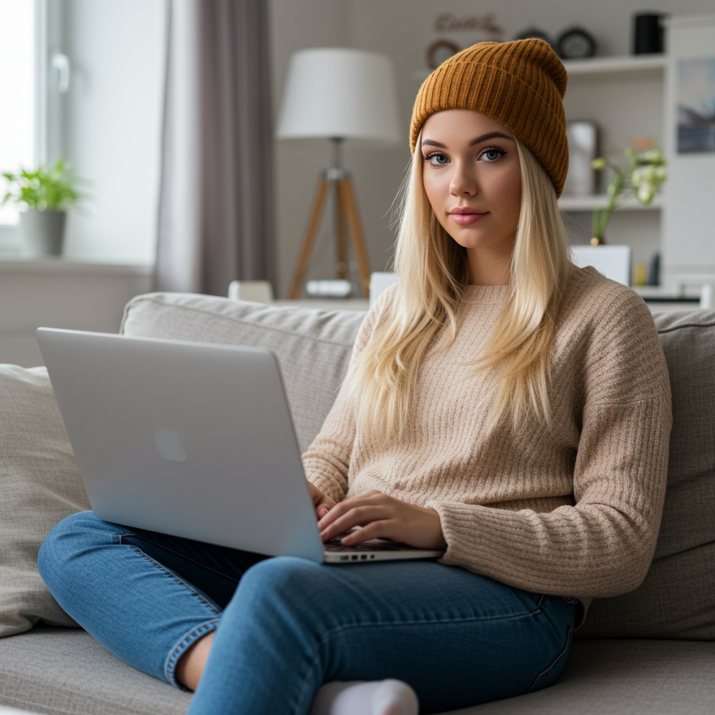 anime, beautiful blonde girl, looking at camera, wearing a thin beanie, jeans, cashmere pullover, sitting on a couch with a macbook in a vibrant living room, bright and lively colors, enhanced details, expressive eyes, natural pose.
