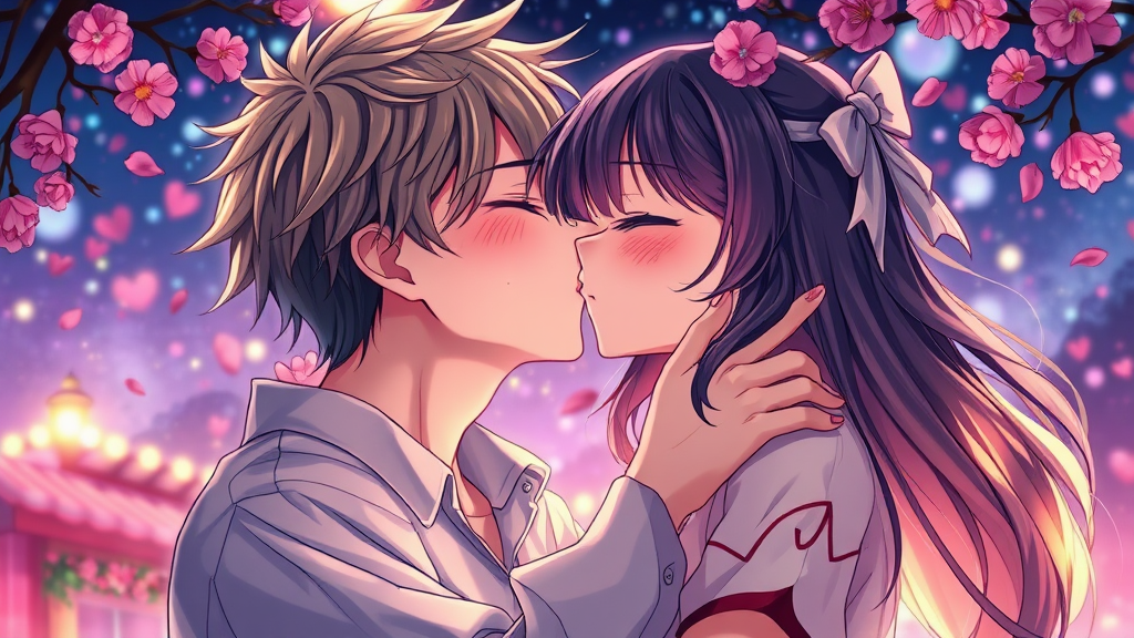 Anime boy passionately kisses a captivating girl, vibrant and detailed, emphasizing romantic and intimate themes, inspired by Yamatogawa's style. Set in a beautifully illustrated scene with expressive characters and vivid colors, focusing on high-quality artwork and emotional depth. The atmosphere captures the essence of an enchanting anime moment with a touch of boldness, all elements harmoniously integrated for an evocative composition.