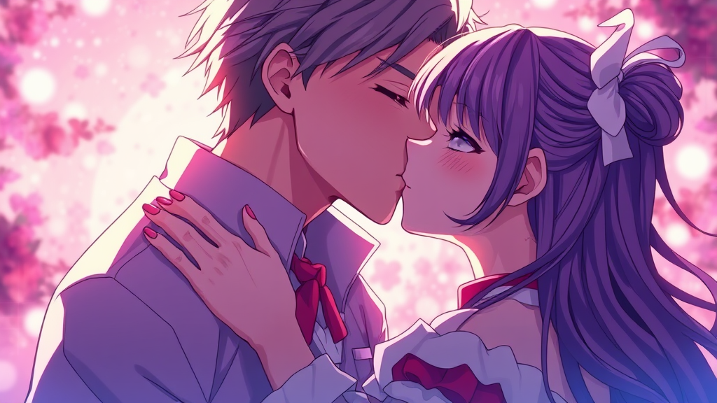 Anime boy shares a passionate kiss with a mesmerizing girl, exquisite detail, romantic tension, bold colors, inspired by the style of Yamatogawa, emphasizing intimacy and connection, in a vivid, high-quality anime artwork with a dreamy atmosphere, maintaining clarity and balance throughout.