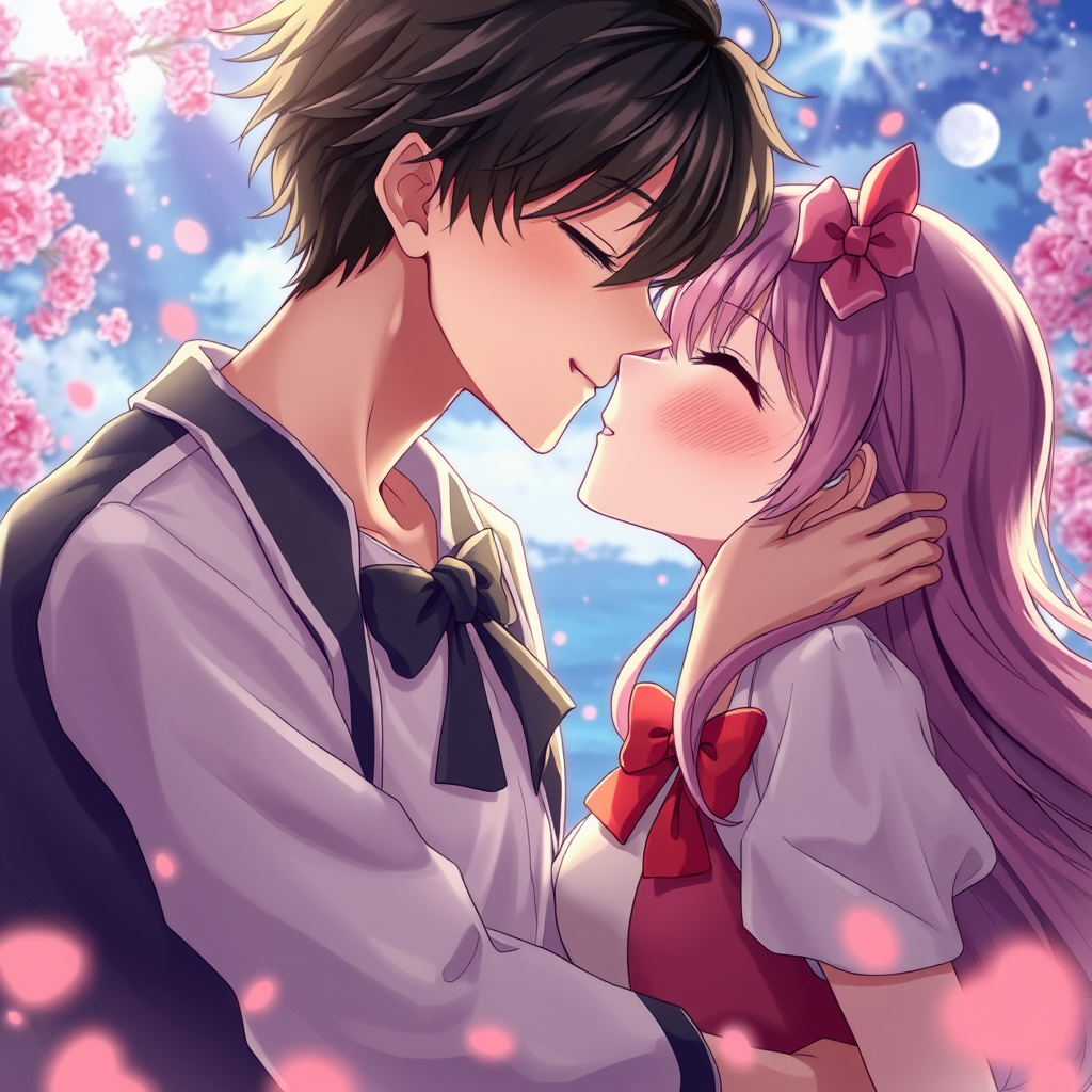 Anime boy shares a tender kiss with a captivating girl, capturing an atmosphere of intimacy and allure, in the artistic style reminiscent of Yamatogawa, evoking the essence of ero anime. Set against a beautifully detailed backdrop, the scene radiates with vibrancy and emotion, highlighting expressive character designs. The image should maintain high quality with sharp, clear details to reflect a polished masterpiece without any distractions such as watermarks or artefacts.