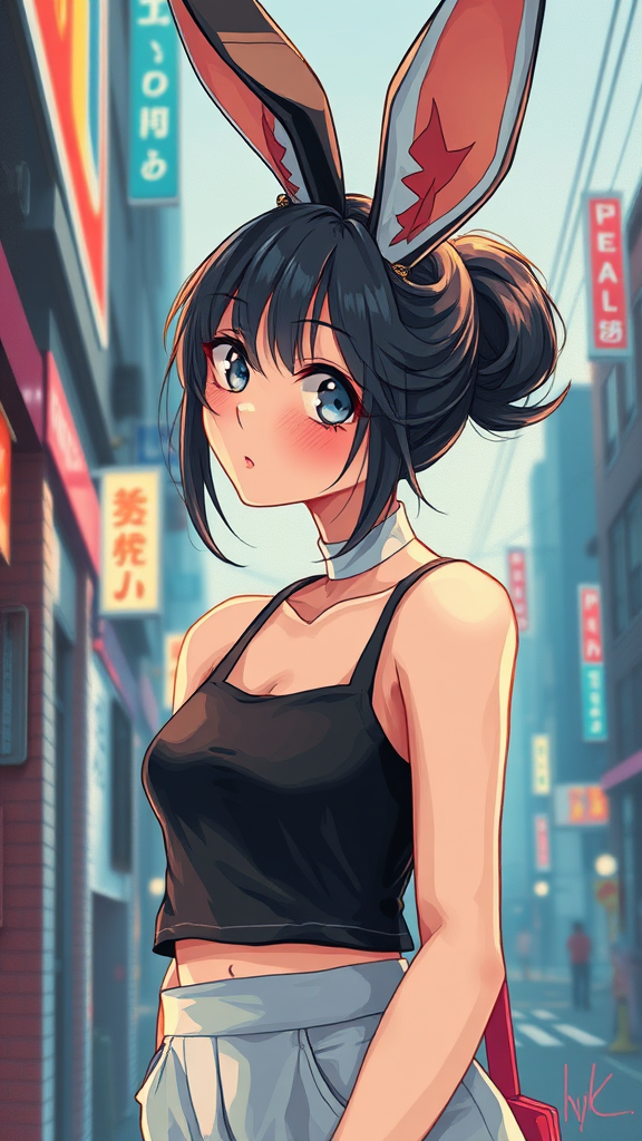 Anime bunny girl painting capturing a modern urban princess, featuring a minimalist yet striking aesthetic with bold and vibrant colors. This highly stylized anime illustration is rendered with hyper-detail, emulating the acrylic painting style. It combines palette knife and brushstroke techniques akin to the works of Makoto Shinkai, Jamie Wit, James Gillyard, and Studio Ghibli, echoing influences from Genshin Impact and Gregg Rutkowski. The composition incorporates Edward Hopper’s atmospheric touch, enhanced with low poly and isometric art elements, while maintaining high detail and sharp focus. With a smooth and ethereal lighting reminiscent of ray tracing, this piece embodies the essence of trending art on platforms like Fanbox Pixiv, ArtStation, and Behance.