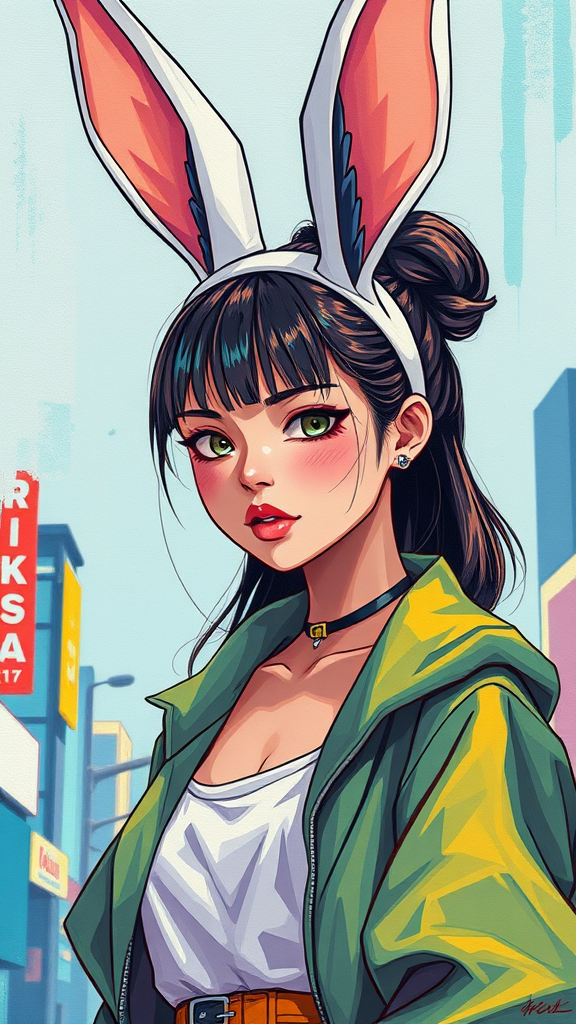 Anime bunny girl painting portraying a contemporary urban princess, captured in a sharp, minimalistic style with bold, striking colors. The highly stylized illustration emphasizes hyper-detail, featuring vibrant hues and intricate acrylic textures. It's a fusion of Makoto Shinkai's atmospheric style with the colorful vibrancy of Jamie Wit and the dynamic brushwork of Gregg Rutkowski. This piece is influenced by the serene storytelling of Studio Ghibli and the imaginative elements of Genshin, incorporating low poly, isometric art aesthetics. High detail work, reminiscent of an ArtStation concept piece, is crafted with ethereal lighting and smooth, sharp focus, resembling the evocative realism of Edward Hopper and the futuristic ambiance of ray tracing techniques.