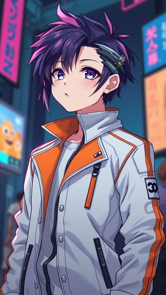 Anime character in a sleek white and orange jacket, imbued with a cyberpunk aesthetic, dark white and lavender hues, featuring precise artistry, spontaneous creativity, official illustration style, vivid exploration of themes, intricate detailing, proportions 1:2, stylized elements, advanced edition.