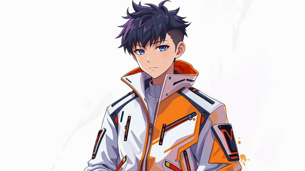 Anime character in a sleek white and orange jacket, embodying the essence of cyberpunk; set against a backdrop of dark white and light violet hues, featuring precise brushwork and an automatism style, showcasing official art qualities with lucid exploration of the subject, high attention to detail, a focus on futuristic elements and intricate design work - a true testament to imaginative storytelling and visual mastery.