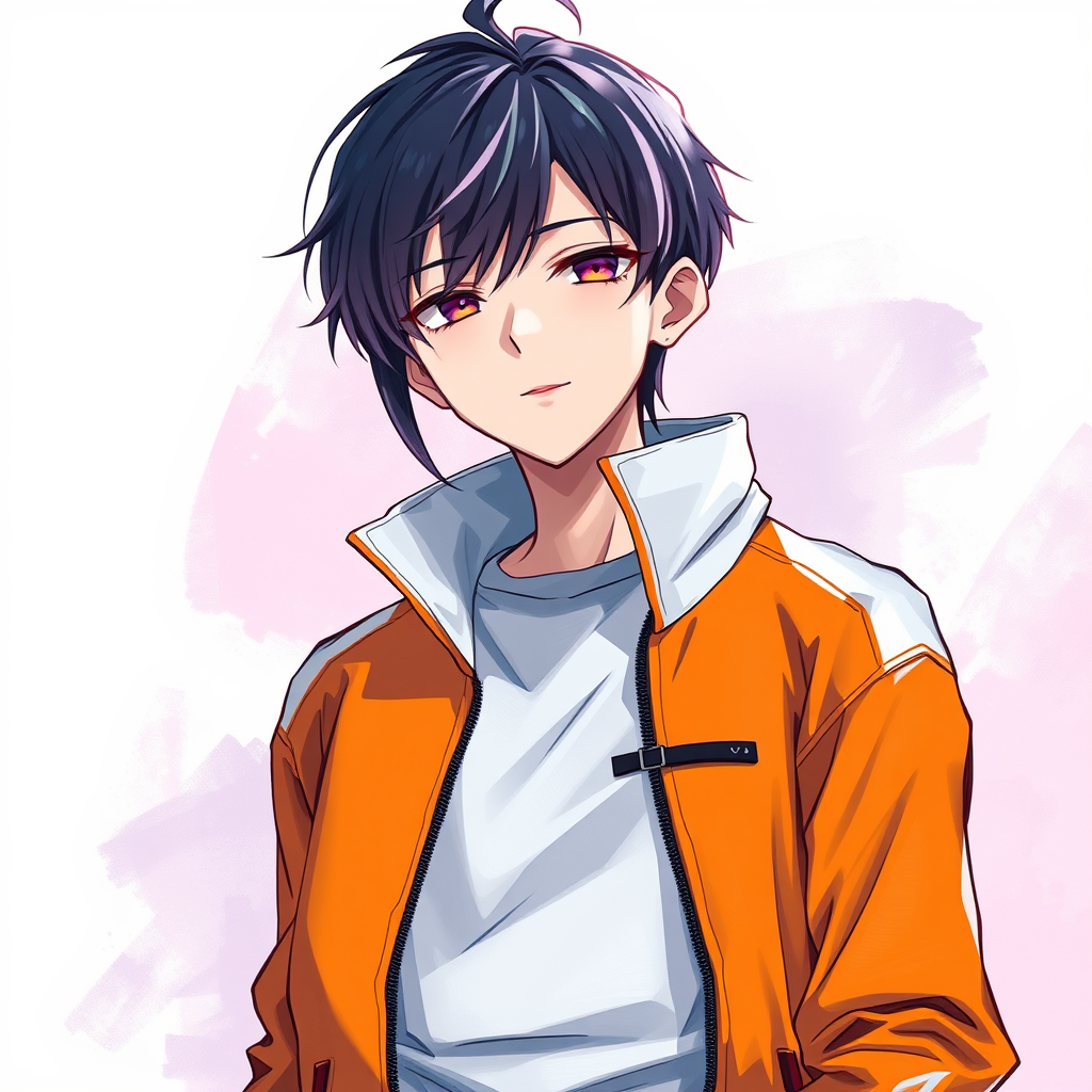 Anime character in a sleek white and orange jacket, embodying a cyberpunk aesthetic, set against a dark white and soft violet backdrop, featuring intricate and precise brushwork. The artwork showcases a sense of automatism with a focus on lucid developments of the character, emphasizing high detail and a polished, official art style.