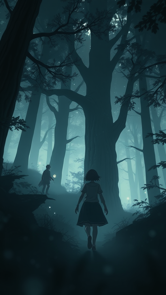 Anime character lost in an enchanting forest, mysteriously guided by ethereal spirits, in the signature style of Hayao Miyazaki. Captured in 8k resolution with high-definition clarity, the scene is illuminated by subtle contour lighting, contrasting shadows enhancing the atmosphere. The intricate depth of field brings out ultra-detailed textures, creating a sense of realism in the fantastical setting. Cinematic framing reveals towering, ancient trees enveloped in mist, enveloping the viewer in a first-person perspective. A bokeh effect adds layers of depth to the epic composition, emphasizing the dark, enigmatic tone. The super-realistic texture of the environment amplifies the sense of being pulled into a captivating, otherworldly realm.