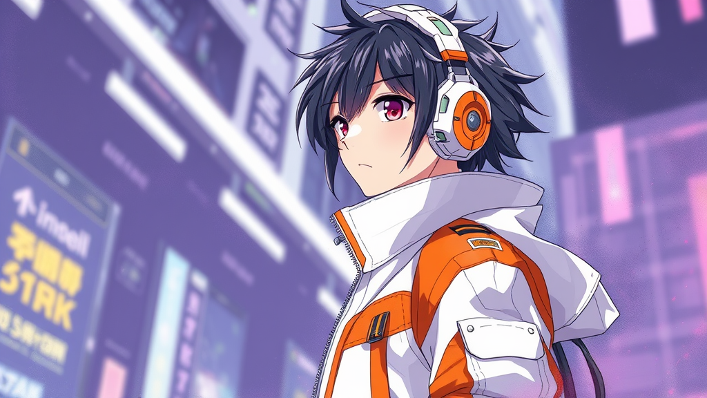 Anime character wearing a futuristic white and orange jacket, set in a cyberpunk world with hues of dark white and light violet, featuring intricate and precise brushwork, emphasizing automatism and a lucid portrayal of the character, showcasing official art quality with high detail and artistic flair.