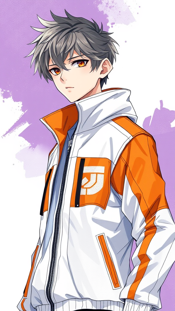 Anime character wearing a sleek white and orange jacket, embodying the cyberpunk aesthetic, set against a backdrop of dark white and light violet hues, showcasing precise brushwork with an air of automatism, capturing the essence of official art. The character is rendered with lucid development of their features, highlighting high detail in design, set in an elongated portrait orientation with artistic flair and innovation.