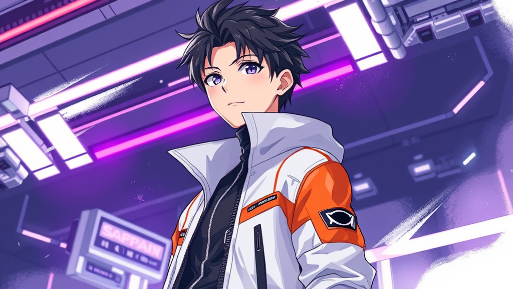 Anime character wearing a sleek white and orange jacket, set in a cyberpunk world with an ambiance of dark white and light violet. The artwork features precise brushwork and exhibits elements of automatism, portraying a dynamic and official art style. The character is depicted with lucid development and high detail, showcasing their futuristic environment with subtle creative touches that enhance the core concept.