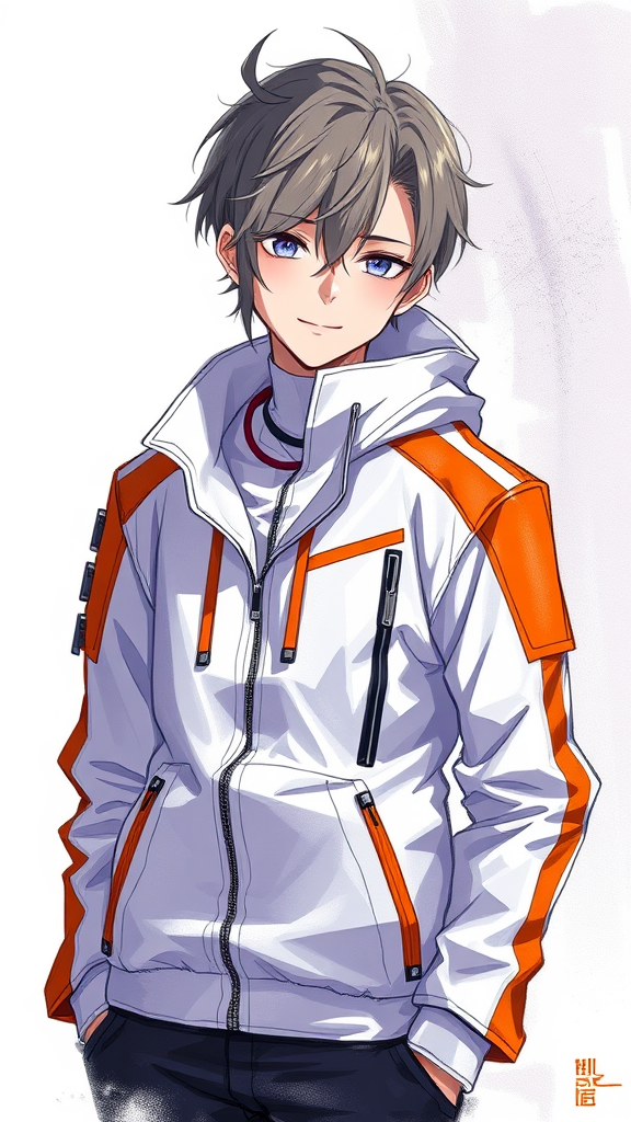 Anime character wearing a sleek white and orange jacket, embodying a cyberpunk aesthetic, set against a dark white and light violet backdrop, featuring precise brushwork with elements of automatism and official art style, showcasing lucid developments of the subject with high detail and creativity.