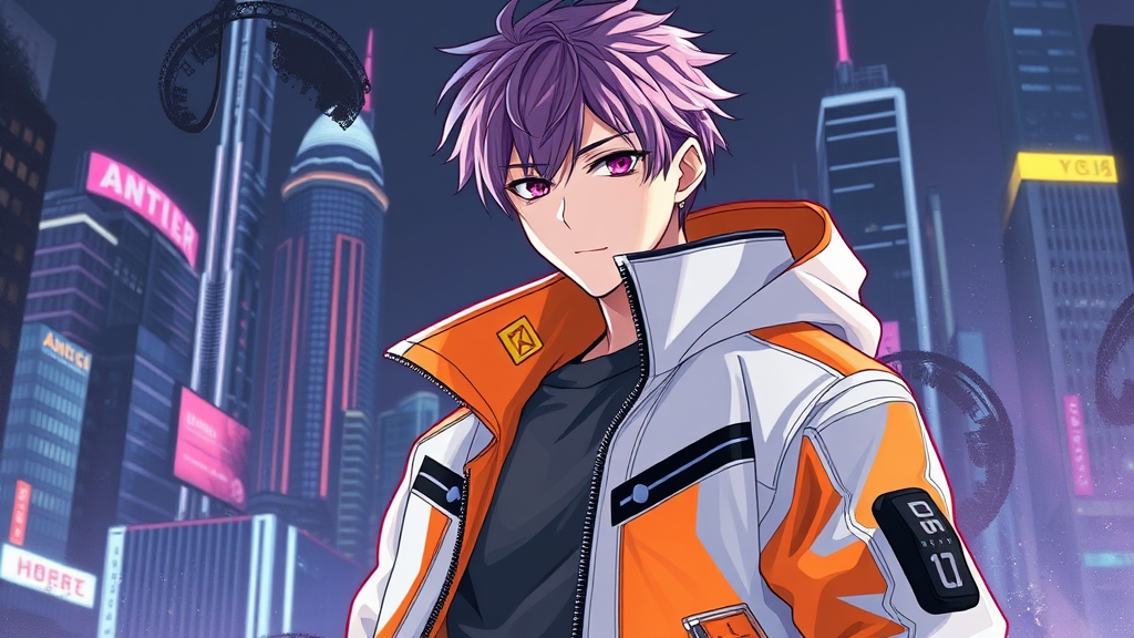 Anime character wearing a sleek white and orange jacket, embodying a cyberpunk aesthetic with dark white and light violet hues, featuring meticulous brushwork and automatism, captured as official art with lucid developments of complex subjects and intricately high detail set against a futuristic cityscape backdrop.