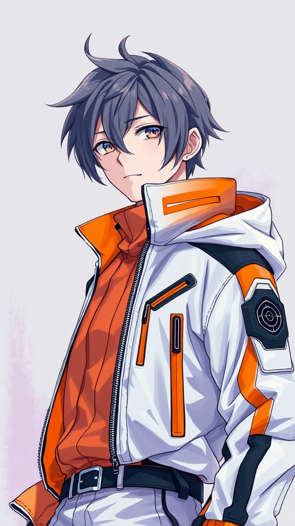 Anime character with a sleek white and orange jacket, embodying a cyberpunk aesthetic, set against a backdrop of dark white and light violet hues, with meticulous brushwork and an air of automatism, harnessing official art style with lucid subject development and intricate detail.