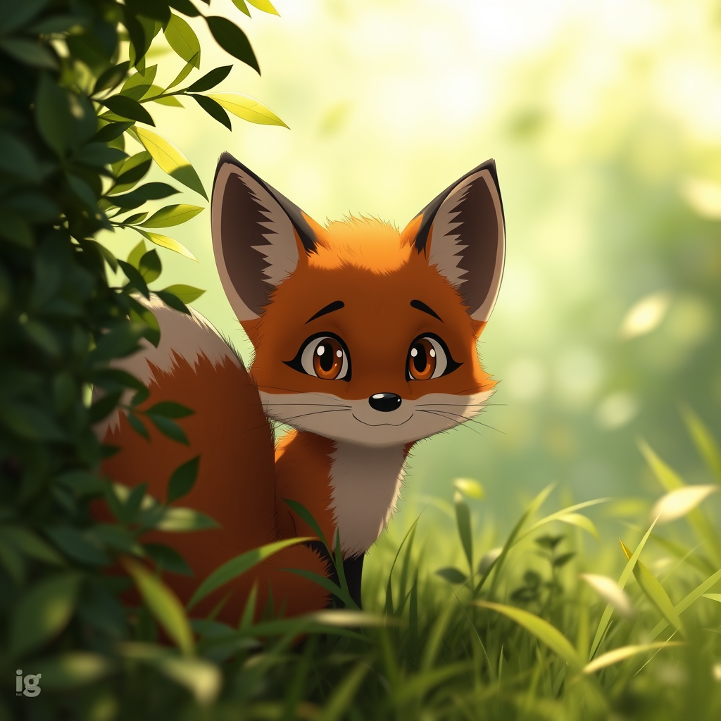 Anime depiction of a timid fox cub with a lush orange fluffy tail, exuding an air of caution by Production I.G, featuring earthy tones and rendered using 3ds Max and V-ray. The scene is set against a tranquil green backdrop, giving a serene atmosphere. Pose the fox cub playfully peeking from behind a bush, its eyes wide and curious, capturing a blend of shyness and intrigue. The surrounding foliage subtly sways, adding a dynamic element to the composition, while soft dappled sunlight filters through, enhancing the peaceful setting.