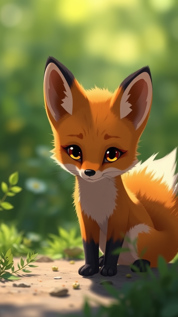 Anime depiction of a timid fox cub with an orange fluffy tail, exuding a sense of caution, crafted in the style of Production I.G. The scene is bathed in earthy tones and features a tranquil green backdrop. Rendered using 3ds Max and V-Ray, the fox cub’s eyes convey an innocent curiosity, its fur gently catching the ambient light. The setting enhances the peaceful atmosphere, with soft greenery and subtle shadows adding depth and harmony to the illustration.
