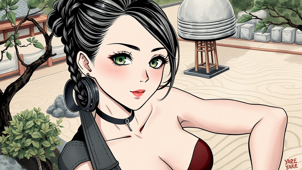 Anime full body Symbolist ink wash painting of a 24-year-old Yao-Greek female edgy rocker girl with a warm and inviting expression, supple, hydrated skin that appears plump and bounces back to the touch, subtle makeup, hint of blush on cheeks, natural pink shade on lips. Inverted triangle-shaped, calm muted green eyes framed by long, elegant eyelashes, braided bun, neatly shaped eyebrows complementing delicate facial features. Strong, muscular arms with lean, defined lines, small breast, toned abs, cybernetic enhancements and accessories, midriff, "Yare Yare" pose. Background features a tranquil Zen garden with raked sand patterns, in the style of Shōji Kawamori. Anime style, key visual, vibrant, studio anime, highly detailed. Creative modifications keep core concept intact.
