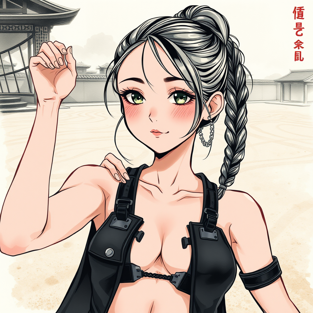 Anime full body Symbolist ink wash painting of a 24-year-old Yao-Greek female edgy rocker girl with a warm and inviting expression. She has supple, hydrated skin that appears plump and bounces back to the touch. She wears subtle makeup, with a hint of blush on her cheeks and a natural pink shade on her lips. Her inverted triangle face frames calm, muted green eyes, accentuated by long, elegant eyelashes. Her hair is styled in a braided bun. Her eyebrows are neatly shaped, complementing her delicate facial features. She has strong, muscular arms with lean, defined lines, a small bust, and toned abs. Cybernetic enhancements peek from her midriff, giving her an edgy, futuristic look. She strikes a "Yare Yare" pose, with the backdrop of a tranquil Zen garden and raked sand patterns, in the style of Shōji Kawamori. This anime-style key visual is vibrant, studio-quality, and highly detailed.