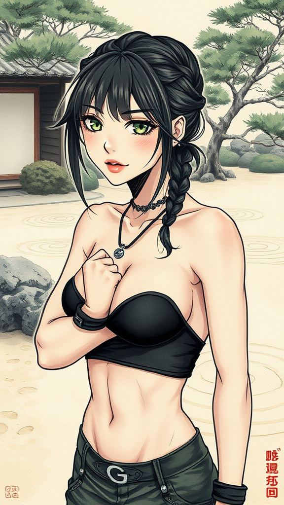Anime full body Symbolist ink wash painting of a 24-year-old Yao-Greek female edgy rocker girl with a warm and inviting expression; supple, hydrated skin with a natural bounce. She wears subtle makeup, featuring a hint of blush and a natural pink shade on her lips. Her inverted triangle, muted green eyes are framed by long, elegant eyelashes, and her hair is styled in a braided bun. Her neatly shaped eyebrows complement her delicate facial features. She has strong, muscular arms, small breasts, and a toned midriff with cybernetic enhancements and accessories. Posing in a "Yare Yare" stance, she is set against a tranquil Zen garden backdrop with raked sand patterns. The painting is in the style of Shōji Kawamori, featuring anime style, vibrant, studio anime aesthetics, with high detail.