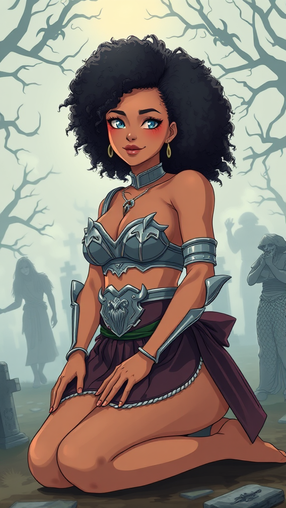 Anime full body thick, bold outlines of a 24-year-old Walloon-Māori female with girl-next-door charm and a warm, inviting expression. She has light olive skin that tans easily, glowing with a golden hue in the summer. Subtle makeup graces her face, a touch of blush on her cheeks and natural pink shade on her lips. Her radiant pale blue, infinity-shaped eyes are framed by long, elegant eyelashes. Her curly afro adds a lively texture, and her neatly shaped eyebrows complement her delicate facial features. Her build displays firm, muscular shoulders, reminiscent of a female bodybuilding style. She dons mermaid-themed armor with a focus on her midriff, paired with samurai battle hakama, and is depicted sitting on her knees. The background showcases an eerie, fog-covered graveyard with haunting spirits, crafted in a style inspired by Masashi Kishimoto, with subtle creative modifications enriching the scene.