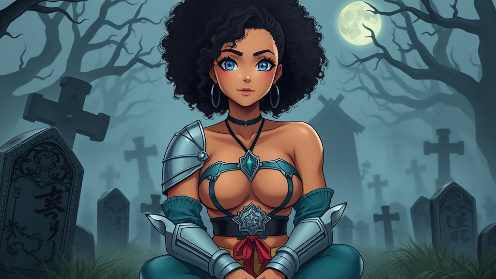 Anime full body Thick, bold outlines of a 24-year-old Walloon-Māori female girl-next-door beauty with a warm and inviting expression. Light olive skin that tans easily, developing a golden hue in summer. Subtle makeup with a hint of blush on cheeks and natural pink lips. Infinity-shaped, radiant, pale blue eyes framed by long, elegant lashes. Curly afro. Neatly shaped eyebrows complementing delicate facial features. Firm, muscular, rounded shoulders with a female bodybuilding style. Mermaid-themed armor, midriff, Samurai battle hakama, sitting on knees. Background of an eerie, fog-covered graveyard with haunting spirits, inspired by Masashi Kishimoto's style.